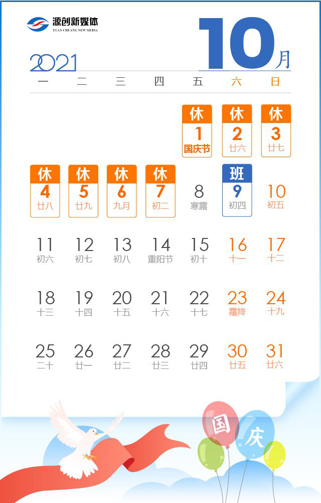 10月1日至7日放假調(diào)休,共7天。9月26日(星期日)、10月9日(星期六)上班。