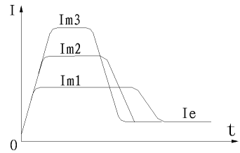 使用限流軟起動模式時,起動時間設(shè)置為零,軟起動器得到起動指令后,其輸出電壓迅速增加,直至輸出電流達(dá)到設(shè)定電流限幅值Im,輸出電流不再增大,電動機運轉(zhuǎn)加速持續(xù)一段時間后電流開始下降,輸出電壓迅速增加,直至全壓輸出,起動過程完成。
