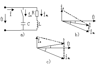 a)補償電路   b)相量圖(欠補償)   c)相量圖(過補償)