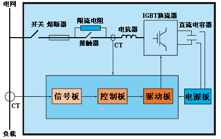 直流電容器為儲能元件并通過IGBT逆變器和接口電抗器電網(wǎng)輸出補(bǔ)償電流;直流電容同時通過電源板為信號板、控制板和驅(qū)動板提供工作電源。