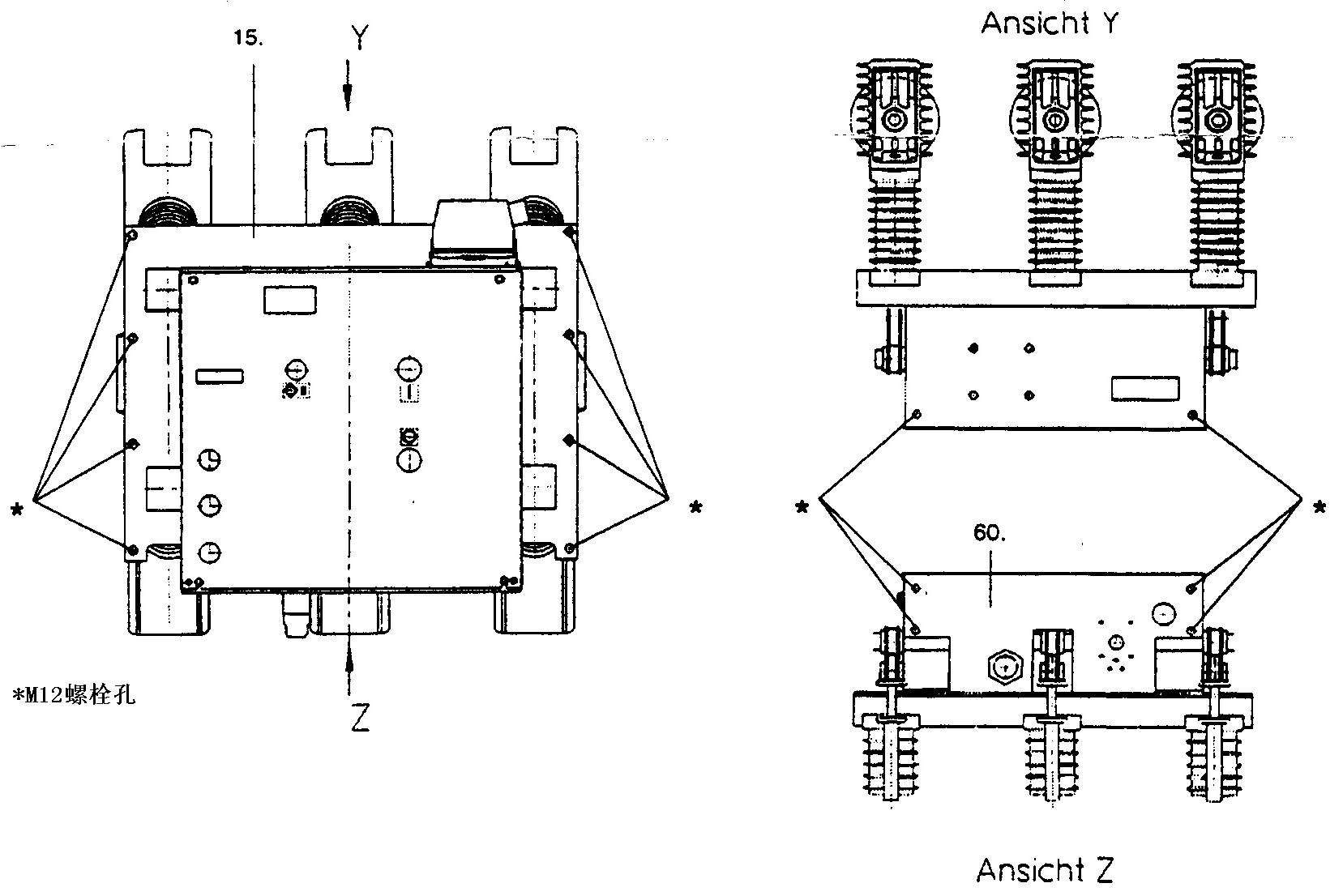 使用連接到機械柜(60.)邊的帶有適當標志的M12端子(70.)上(見圖3/3)的扁銅,銅纜或鍍鋅鋼帶(DIN VDE 0141/7.76 項目5.3),把源創電氣真空斷路器連接到專用的高壓保護接地